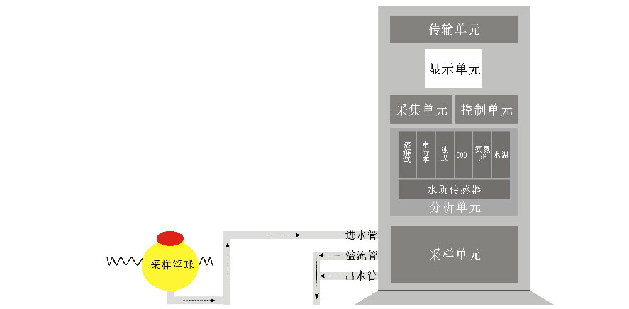 固定式微型水質自動監測站由前端采樣單元、水質傳感器監測單元、數據采集控制單元、數據傳輸單元,后端數據接收服務、環境監測控制平臺及數據處理分析應用功能組成。系統構架圖如下: