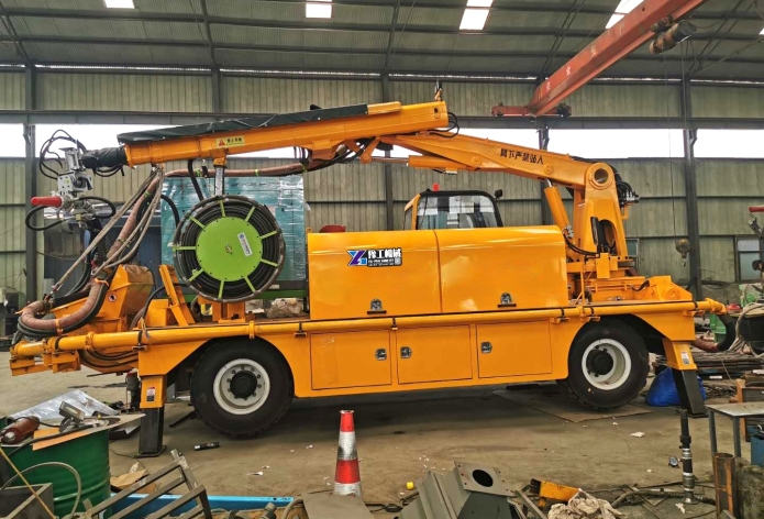 隧道機(jī)械手整機(jī)高度低,回轉(zhuǎn)半徑小,能夠使用于施工場(chǎng)地受限的工程;同時(shí)底盤(pán)采用剛性底盤(pán),內(nèi)燃-靜液壓傳